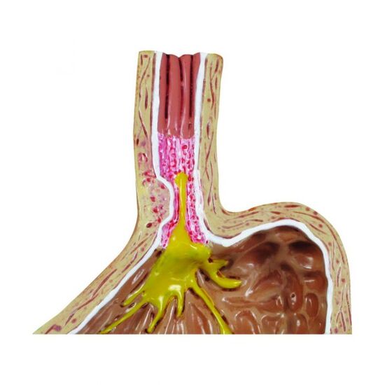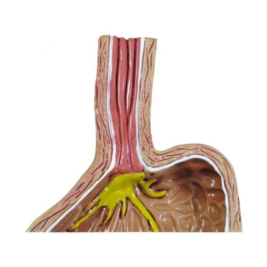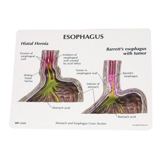 The Gastro Esophageal Reflux Disease Four-piece model of progressive stages of GERD. Conditions include: normal, sliding hiatal hernia and acid reflux; chronic acid reflux/Barrett’s esophagus; Barrett’s esophagus/adeno carcinoma.