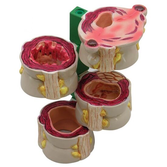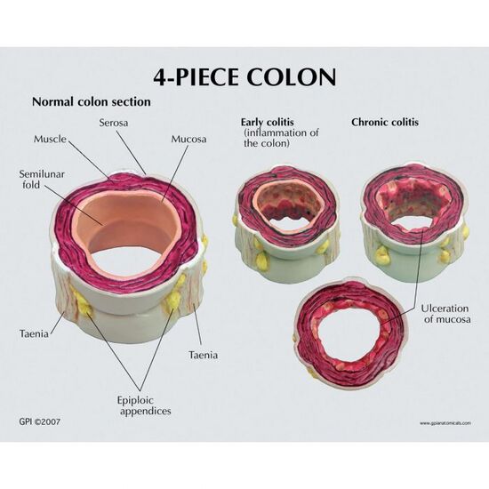 Four-piece colon model with cross-section of the human colon demonstrating both normal and various disease conditions. Structures included in the normal anatomy include: serosa, muscle, mucosa, semilunar folds, taenia, and epiploil appendices. Diseases represented are: polyps, cancer, diverticulitis, and colitis.
