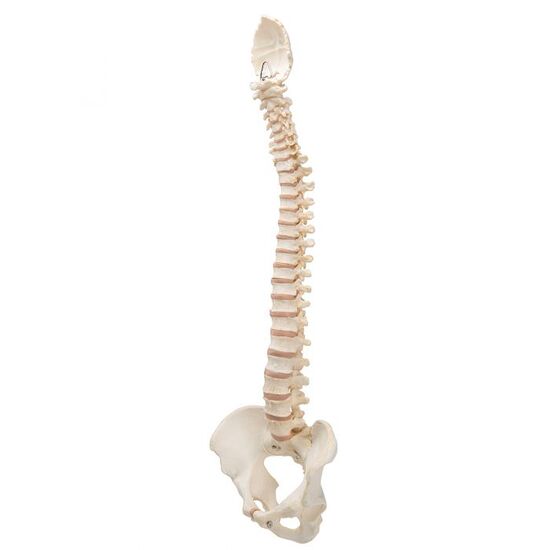 This anatomical replica of the human spine is a flexible, mounted, true-to-life model of the human vertebral column in excellent BONElike quality. The spine is an original reproduction of all anatomical details, based on real weight. The spinal column model consists of the male pelvis and occipital bone. Occipital bone and atlas can be detached individually from the spine. This vertebral column is delivered without stand, see A59/8.