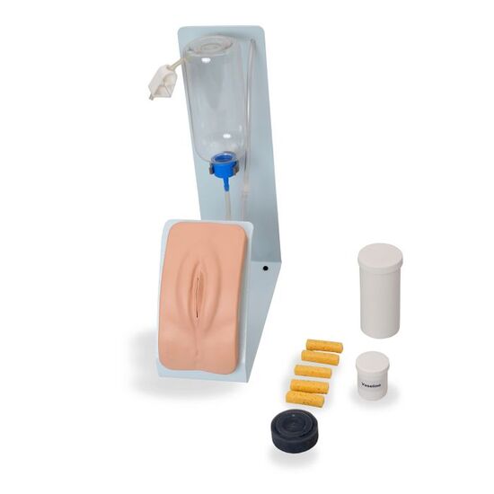 With the female P93 BASIC catheterization trainer, female bladder catheterization procedures can be realistically demonstrated, practiced and assessed. The genital insert is placed into the holder and held in place with magnets. The material of the insert is soft and flexible: the labia are movable and can be spread. This way the student can practice all the necessary gestures for catheterization (e.g. disinfection). The material gives a realistic feeling when inserting and removing the catheter into the bladder with realistic resistance and insertion depths.