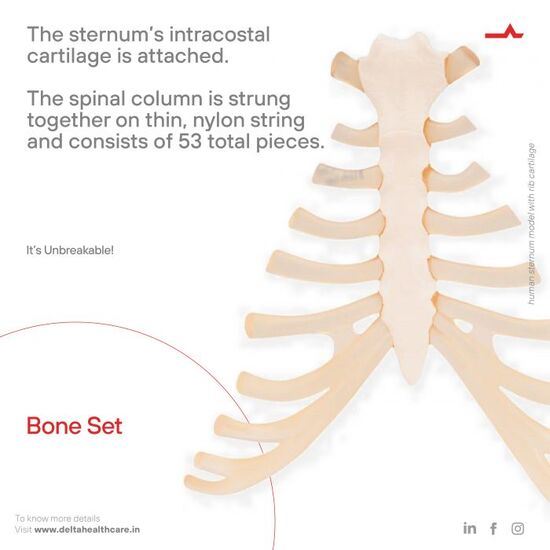 This replica of a disarticulated half human skeleton is complete with mounted skull, sternum, hyoid, and spinal column on thin nylon string. The hand and foot are loosely articulated on nylon cord for study of more realistic movement.This highly detailed disarticulated skeleton is great for anatomy studies. Consists of 30 pieces. Comes in a sturdy partitioned cardboard storage box.