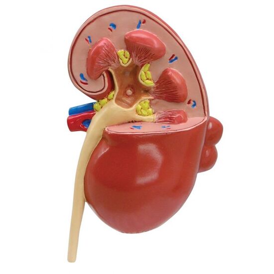 This oversized two-sided kidney model has a normal anatomy cutaway on one side and a diseased anatomy cutaway on the other side depicting: infection, scarring, atrophy, urinary (kidney) stones, tumor, polycystic disease, hypertension effects.