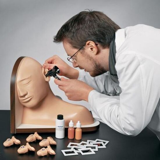 This ear examination simulator allows practice in the examination of the ear. The ear examination simulator consists of a head with 6 interchangeable flexible ears with lifelike external and internal structures of the ear. Embedded ed prints in 5 out of the 6 ears allow the diagnosis from ear examination of various pathologies. One ear is not ed, but can be used for ear wax removal exercises. The ear examination simulator is supplied with 2 tubes of synthetic earwax, nine 35mm slides (5 conditions as below plus 4 conditions of our supplementary set W44123) and a carry-case. An Otoscope is not included with the ear examination simulator. The following normal conditions and pathologies can be observed: