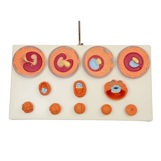 The model represents the development of the human germ cells from fertilization until the end of the 2nd month of pregnancy in 12 stages. Each stage can be removed from the common stand as an individual part and can be purposefully used for teaching and tests for the embryological specialist field.
