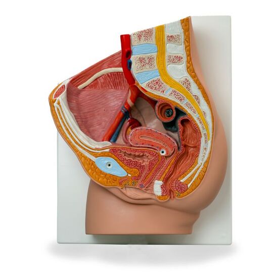 This female pelvis is in median section. This female anatomy model shows one half of the female genital organs with bladder and removable rectum. The female pelvis is delivered on baseboard offering the possibility to be mounted to the wall for easy display in the classroom or doctor’s office. This model is high quality and shows the female pelvis in anatomical detail.