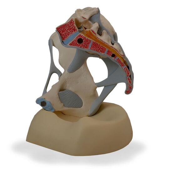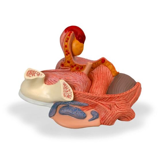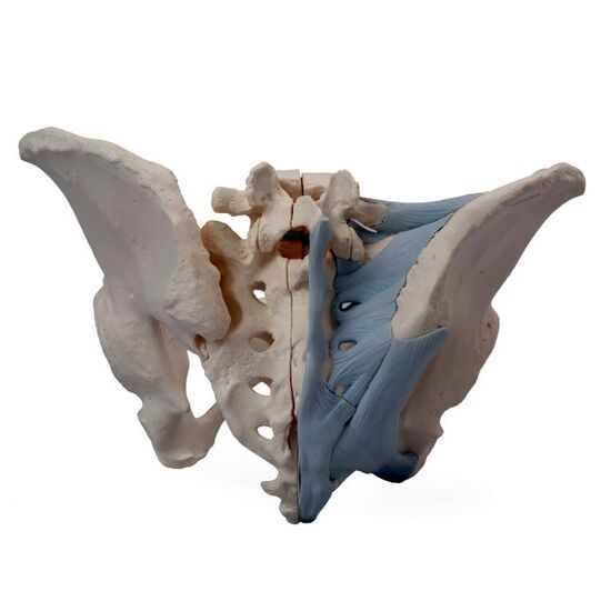 This life size four part model of a female pelvis represents detailed information about the topography of bones, ligaments, pelvic floor muscles and female pelvic organs. The right half shows the bones with pelvic ligaments. In addition, the left half of the pelvis contains the muscles of the pelvic floor including elevator ani, ischiocavernosus, deep and superficial transverse perineal, external anal sphincter, external urethral sphincter.