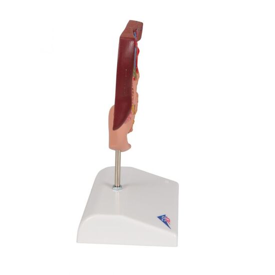 This graphic gallstone model for patient education shows the anatomy of the biliary system and its surroundings in half natural size. Both acute inflammation (cholecystitis) and the tissue changes caused by chronic inflammation can be identified in the gallbladder wall. Gallstones can be found in the following typical locations: