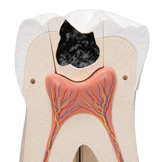 This giant molar model depicts an upper triple-root molar and separates into 5 parts. The molar features a longitudinal section through the crown, two roots and the pulp cavity. The giant molar contains removable pulp and three tooth inserts with different stages of advanced cavities. Giant molar with dental cavities on stand.
