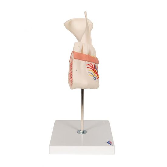 The model represents half of the left lower jaw of a young person. One section of bone is removable from the half lower jaw to expose the tooth roots, spongiosa, vessels and nerves. Canine and first molar are removable from the half lower jaw, and longitudinally sectioned.