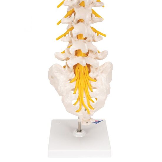 The lumbar model includes a prolapsed inter-vertebral disc between the 3rd and 4th lumbar vertebrae. This high quality anatomical model of the lumbar spinal column is delivered on removable stand.