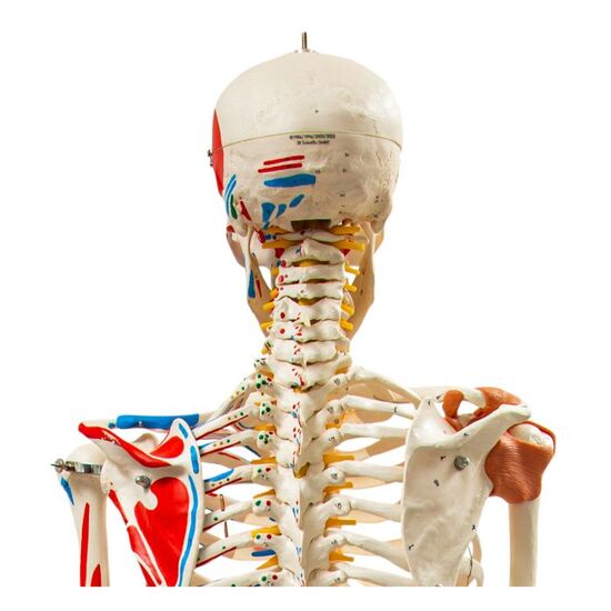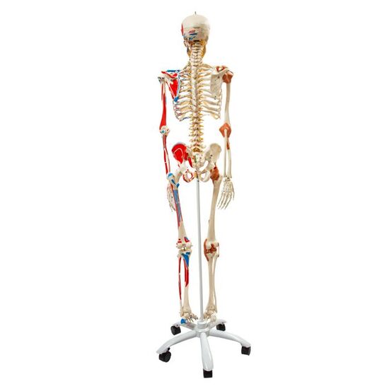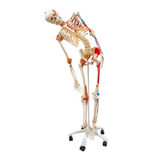 Sam offers all the advantages of a skeleton. With Sam, you can also demonstrate the movements of the skull via the head joints, and thanks to the fully flexible spine, you can adjust the model to place it in natural body postures. The unique combination of muscle origins and insertions, the numbered bones, flexible ligaments and flexible spine with a slipped disc between the 3rd and 4th lumbar vertebrae clearly the show medical and anatomical interest of this top model’s more than 600 structures. Now available on a stable metal stand with 5 casters!