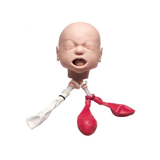 Realistic anatomy includes mouth, tongue, oral pharynx, larynx, epiglottis, vocal cords, trachea, and esophagus. Separate lungs for auscultation. Inflatable stomach bladder indicated esophageal insufflation. Practice suctioning and oral intubation techniques. Each trainer includes a stand to mount head, pump spray lubricant, and hard carrying case. Can be attached to Basic Infant CRiSis manikin (W44717/1017248).