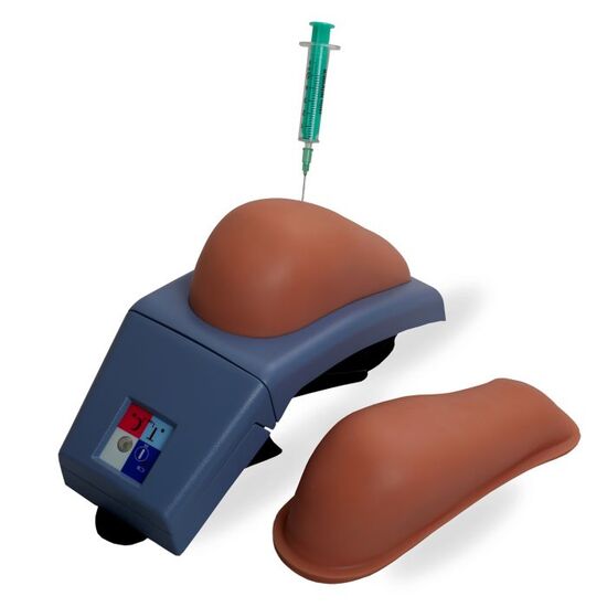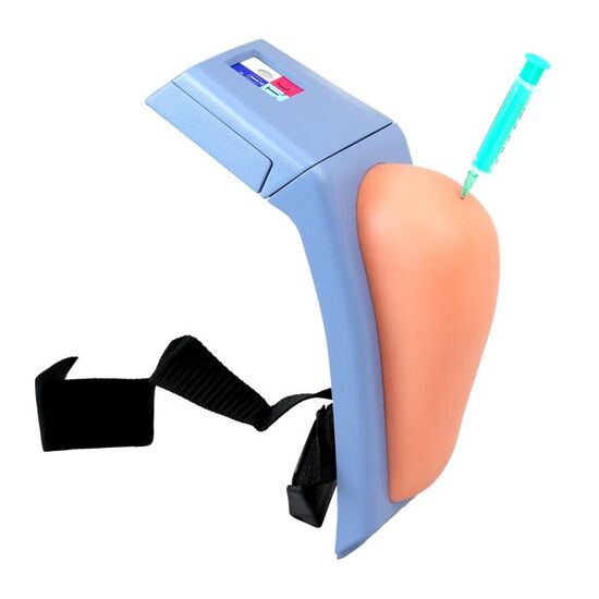 1. This high-quality I.M. simulator represents a right upper arm with all important anatomical palpable landmarks such as acromion and humerus. The realistic anatomy allows for placing correct intramuscular injections in an exceptionally graphic way. The built-in fine electronics produce audio-visual feedback of the result, e.g. correct or incorrect injection, bone contact, or wrong location. Additional trainings and control modes optionally provide an immediate or subsequent performance check under training conditions. The included lifelike silicone skin is extremely durable and can be quickly and easily exchanged when necessary.