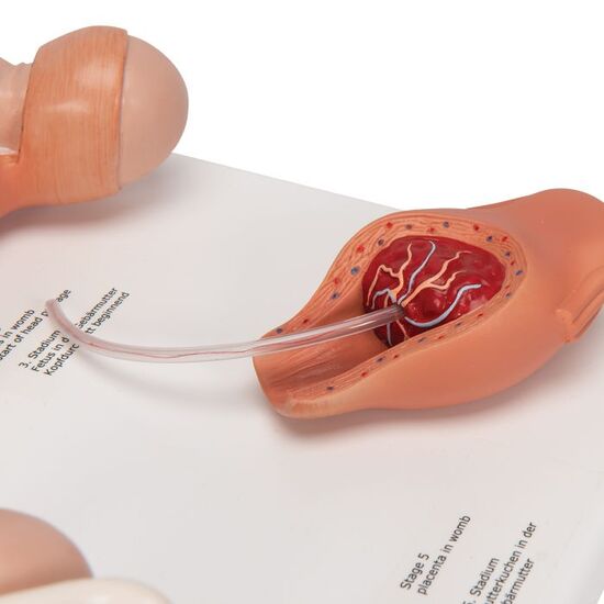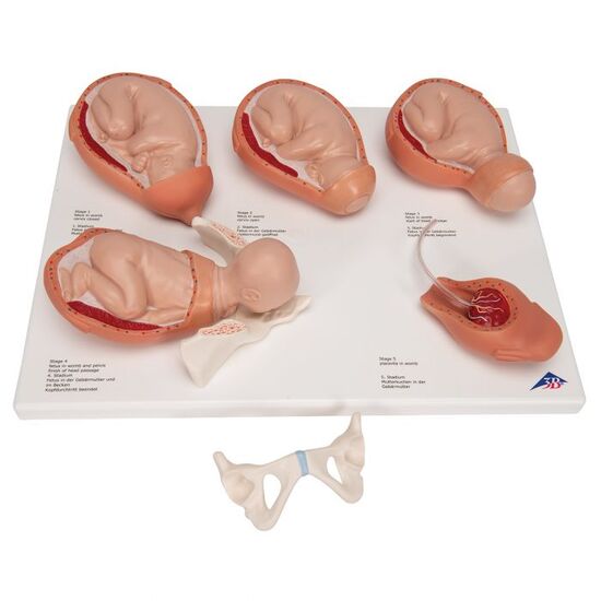 Like VG392 anatomical representation of human birth, but reduced in size to 50%. The birth model is supplied on baseboard. 5 stages of human birth, mounted individually on bases: