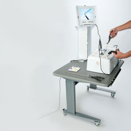 1. The trainer nests inside and attaches to the pedestal for transportation. It has a large pelvic work area, High-Definition-1080p SimScope (camera) and a 12? high-resolution monitor. The SimScope telescopes, rotates, and is available in 0degree and 30degree versions.