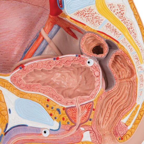 The male pelvis anatomy model is shown in median section. One half of male genital organs with bladder is shown at the normal position in the male pelvis. The rectum is removable for a more detailed study of the male pelvic anatomy. This high quality anatomy model is delivered on baseboard offering the possibility to be mounted to the wall.
