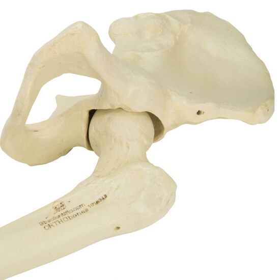 Left hip with femur. The thigh bone is attached with an elastic nylon band to the acetabulum. The basic anatomical function of the joint can be shown.