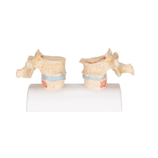 Impressive didactic model for comparing osteoporotic and normal thoracic vertebrae. Ideal for medical studies and patient consultation. The 11th and 12th thoracic vertebrae are shown.