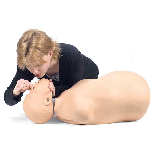 Students always wonder how CPR manikins will compare with real victims, especially those who are older or obese. This unique manikin helps to prepare students to respond to a more typical cardiac arrest event with a victim who is elderly and overweight. Features: elderly physical appearance, large body type with extra “fat” layer, realistic head tilt and chin lift for opening the airway, and palpable and visual anatomical landmarks, including the sternum, rib cage, and substernal notch. The airway can be manipulated to simulate airway obstruction or choking situations. Also includes three mouth/nose pieces, three disposable lung/airway systems, and a convenient carrying bag.