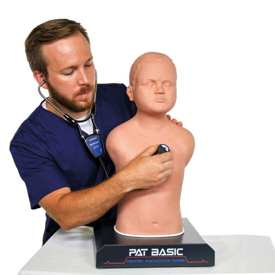 The PAT BASIC trainer engages the technology of the SimScope stethoscope to simulate pediatric heart, lung, and bowel sounds utilizing a large sounds library. Using the provided SimScope stethoscope, users are able to access a large variety of pathological conditions in order to customize scenarios.