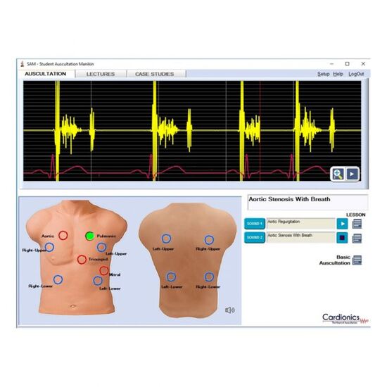 SAM 3G can be used in conjunction with SAM Online, the Cardionics teaching program that allows students 24/7 access to SAM’s sounds library from any computer connected to the Internet. This program also has over 40 lessons on auscultation with illustrations, diagrams, phonocardiograms, questions and answers. The Site-License is included.