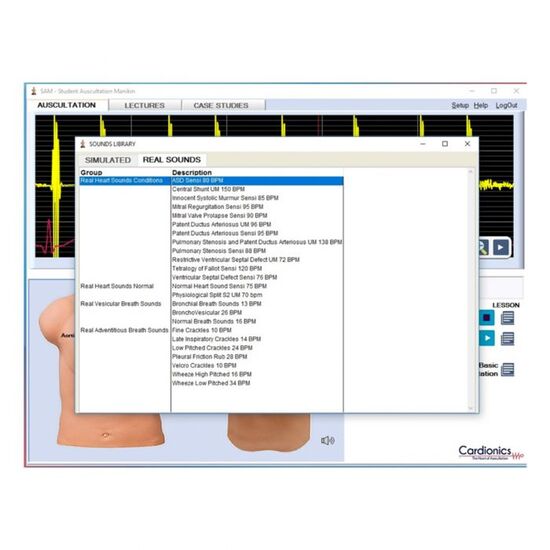 Auscultation is an essential clinical skill needed to assess and monitor patients conditions. With the new Cardionics SAM 3G Student Auscultation Manikin 3rd Generation, teaching and learning this skill becomes even more versatile and economic. SAM 3G Trainer can be used with any stethoscope available and offers the largest Real Sound Library, Case Videos, Echo Cardiogram Videos and ECG Waveforms for students to master identification of various heart, lung and bowel sounds. All sounds and videos are recorded from live patients for students to experience a life-like simulation. Case videos contain patient and clinical interactions for various conditions and enhance the learning by providing visual representation of the sounds. Users can also create and save their own case videos.
