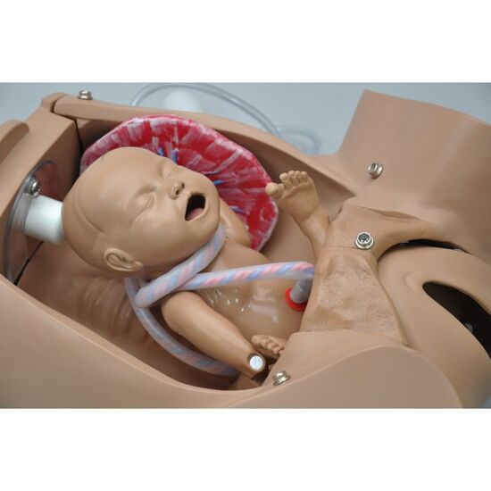 birthing baby, 2 placentas, 3 umbilical cords, 2 umbilical clamps, episiotomy perineum insert, 48 hour postpartum uterine, elevating pillow, silicone lubricant, talcum powder and carrying bag.
