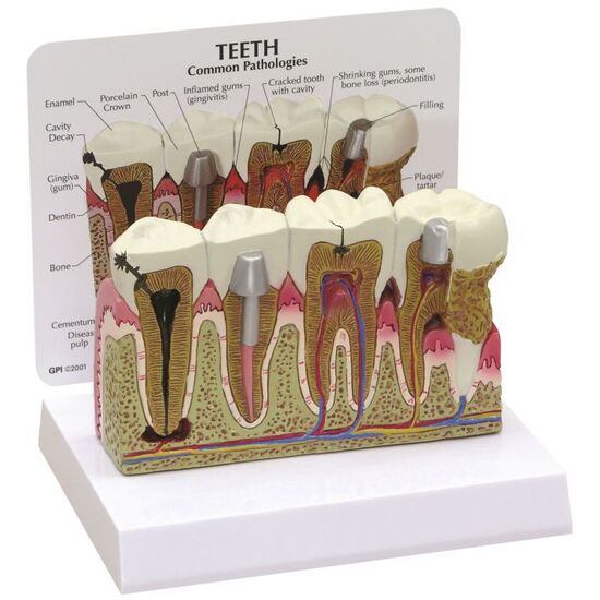1. Oversized model of teeth including premolars and molars featuring many common dental problems, some of which are: abscess, advanced periodontitis, cavity, crown, decay, filling, gingivitis, plaque, and severe bone loss.
