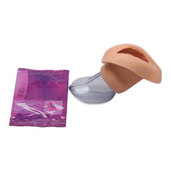 This model shows the labia and vagina up to the cervix in a simplified representation for didactic reasons, and is used for demonstrating and learning the insertion of a female condom. Supplied with three Femidom condoms.
