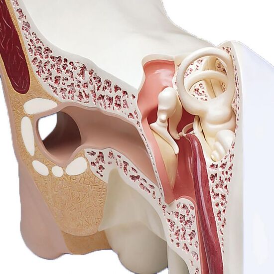 At 15 times life-size, this 3-part human ear is suitable for museums and special collections as well as large lecture halls and conferences. The giant ear represents the outer, middle and inner ear. The auditory ossicles and the labyrinth with cochlea and vestibulocochlear nerve can be removed from the ear and studied in detail.